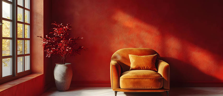The red living room walls form a very hospitable room. Rich reds, wine all the way to terracotta, can heat any space and provide that snuggly enclosed, intimate feeling that is ideal in small living rooms.